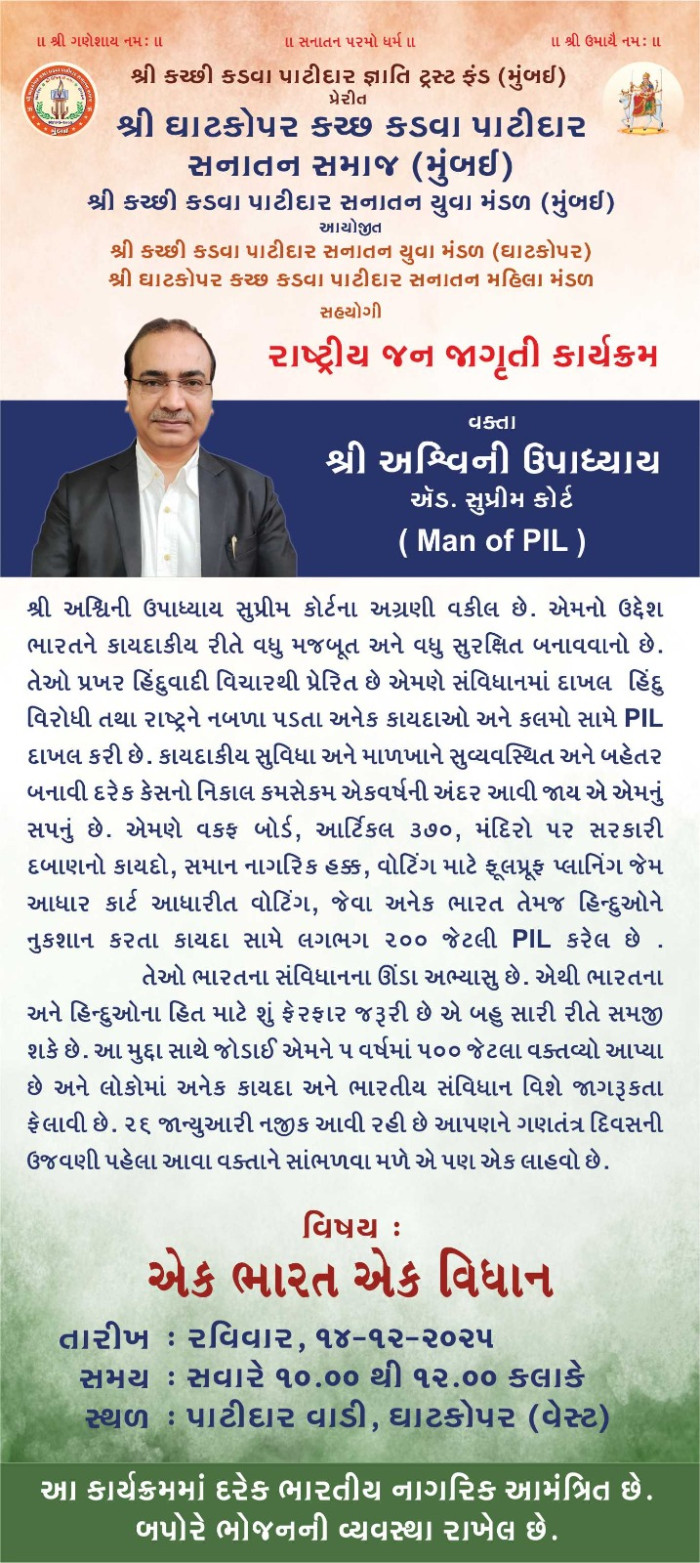 Events Details - રાષ્ટ્રીય જન જાગૃતિ કાર્યક્રમ વક્તા શ્રી અશ્વિની ઉપાધ્યાય