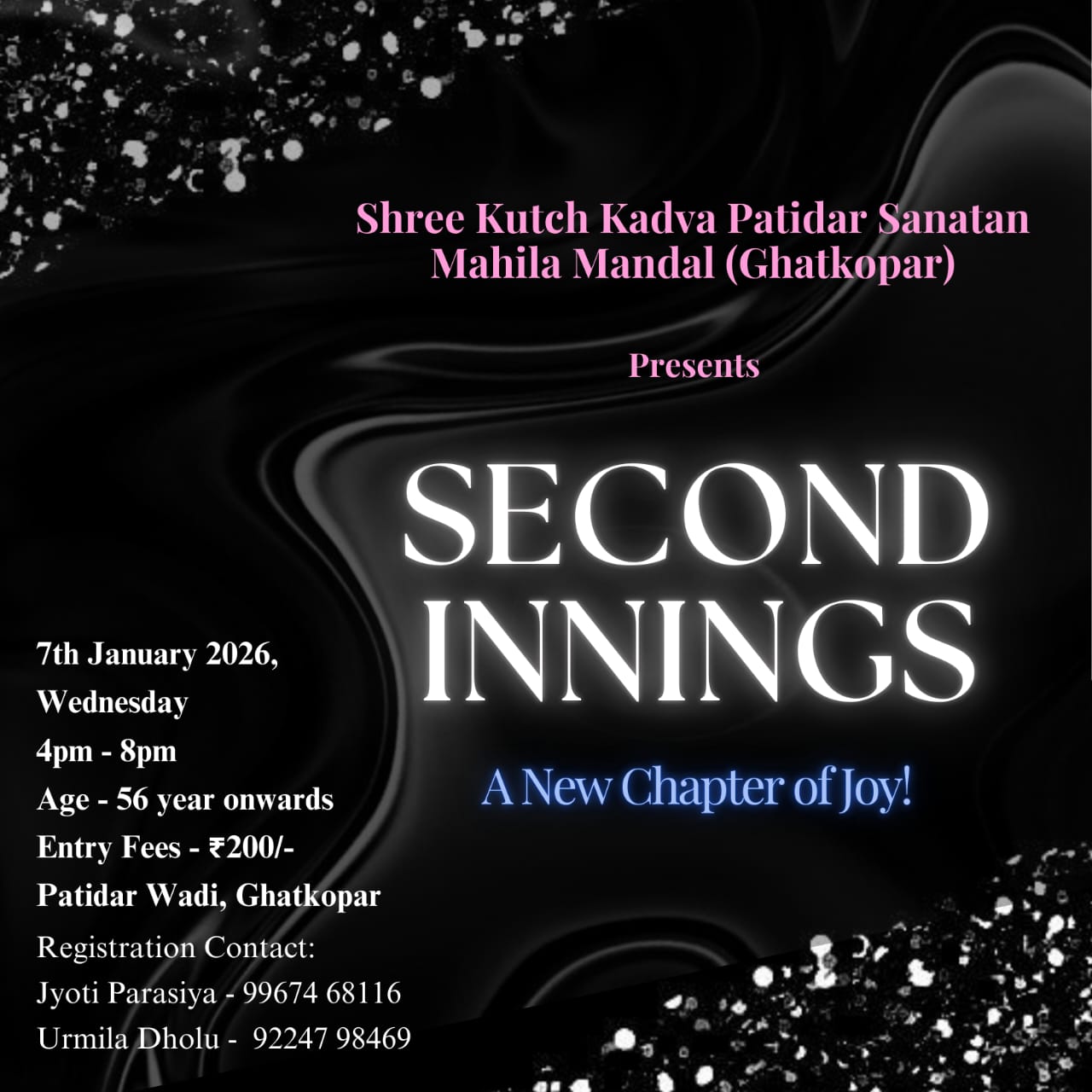 | Event Details | : | જીવનની નવી ઉડાન... Second Innings આ સેકન્ડ ઈનિંગના પ્લેયર એટલે આપ સૌ વડીલો અને અમારા પથ દર્શક. ઘાટકોપર મહિલા મંડળ આપ સૌને આમંત્રિત કરે છે મજા મસ્તી અને સ્મિતોથી ભરપૂર એક યાદગાર દિવસને માણવા તો આવો પૂરા ઉત્સાહ અને ઉમંગથી તેને યાદગાર બનાવીએ અને ઉજવીએ. તારીખ : ૭ જાન્યુઆરી, બુધવાર ૨૦૨૬ સમય : સાંજે ૪ થી ૮ વય મર્યાદા : ૫૫ વર્ષથી ઉપરની બહેનો એન્ટ્રી ફી : ૨૦૦₹ સ્થળ : પાટીદારવાડી, ઘાટકોપર. |